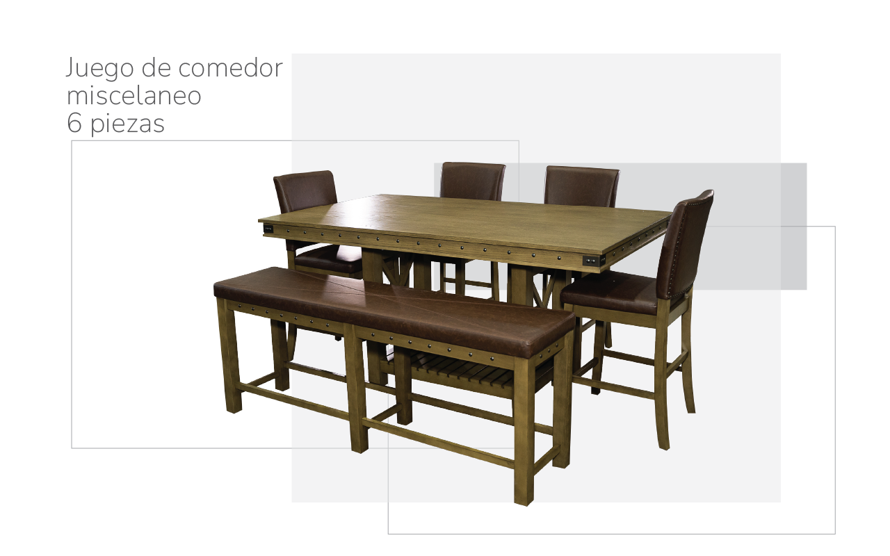 Juego de comedor para 6 personas Commodity modelo BAKERCOM6PUB. Fabricado sobre una resistente base de MDF que le da ese aspecto clásico. Cuenta además con un banco diseñado con un estilo contemporáneo para mayor comodidad. Sorprende a tus familiares y amigos con este fantástico juego de comedor.